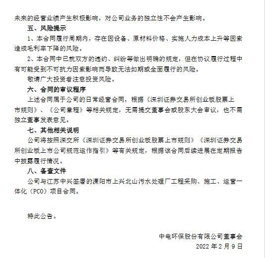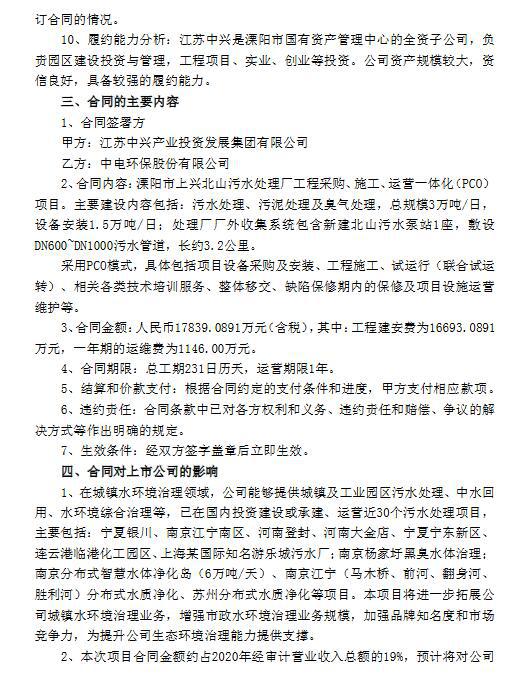2022年2月9日,公司與江蘇中興簽署了溧陽市上興北山污水處理廠工程采購、施工、運營一體化(PCO)項目合同,合同總額人民幣約1.78億元(含稅)。